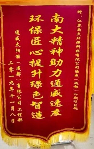 南大精神助力通威速度 環(huán)保匠心提升綠色“智”造——南大環(huán)保受到通威太陽(yáng)能(成都)有限公司表彰近日,江蘇南大環(huán)??萍加邢薰臼盏酵ㄍ?yáng)能(成都)有限公司的錦旗和表彰信,南大環(huán)保在年產(chǎn)3.8GW高效晶體硅太陽(yáng)能電池互聯(lián)...